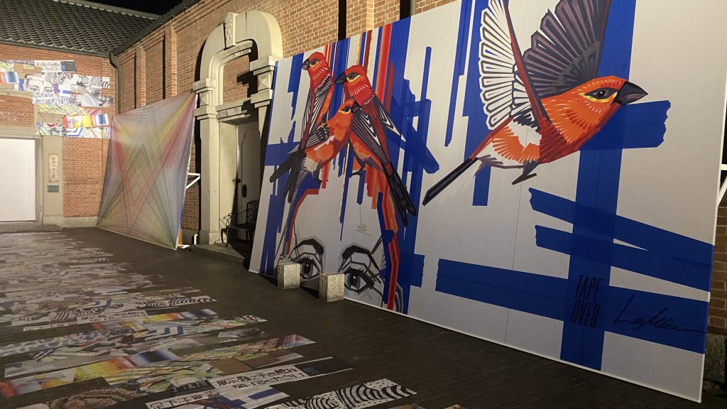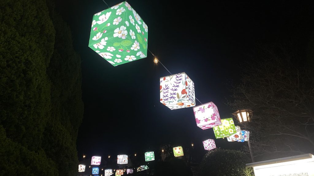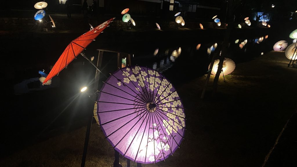 ライトアップされた和傘が並んでおり、とても風情のある展示がされています。