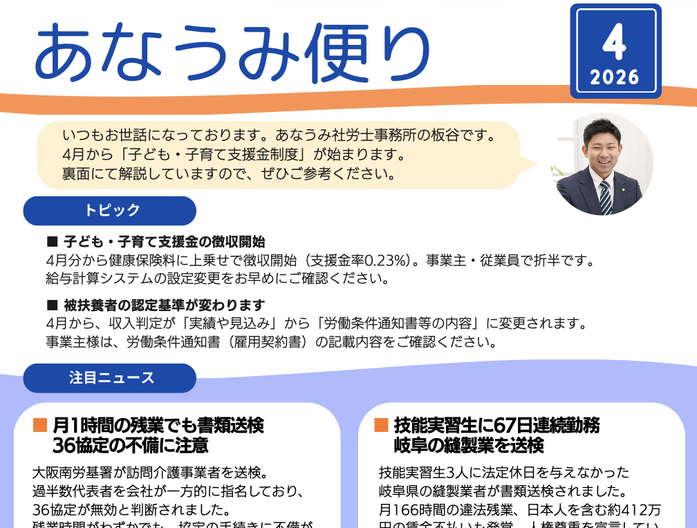 事務所だよりを毎月1回発行しているのですが、今回からフォーマットを一新しました。